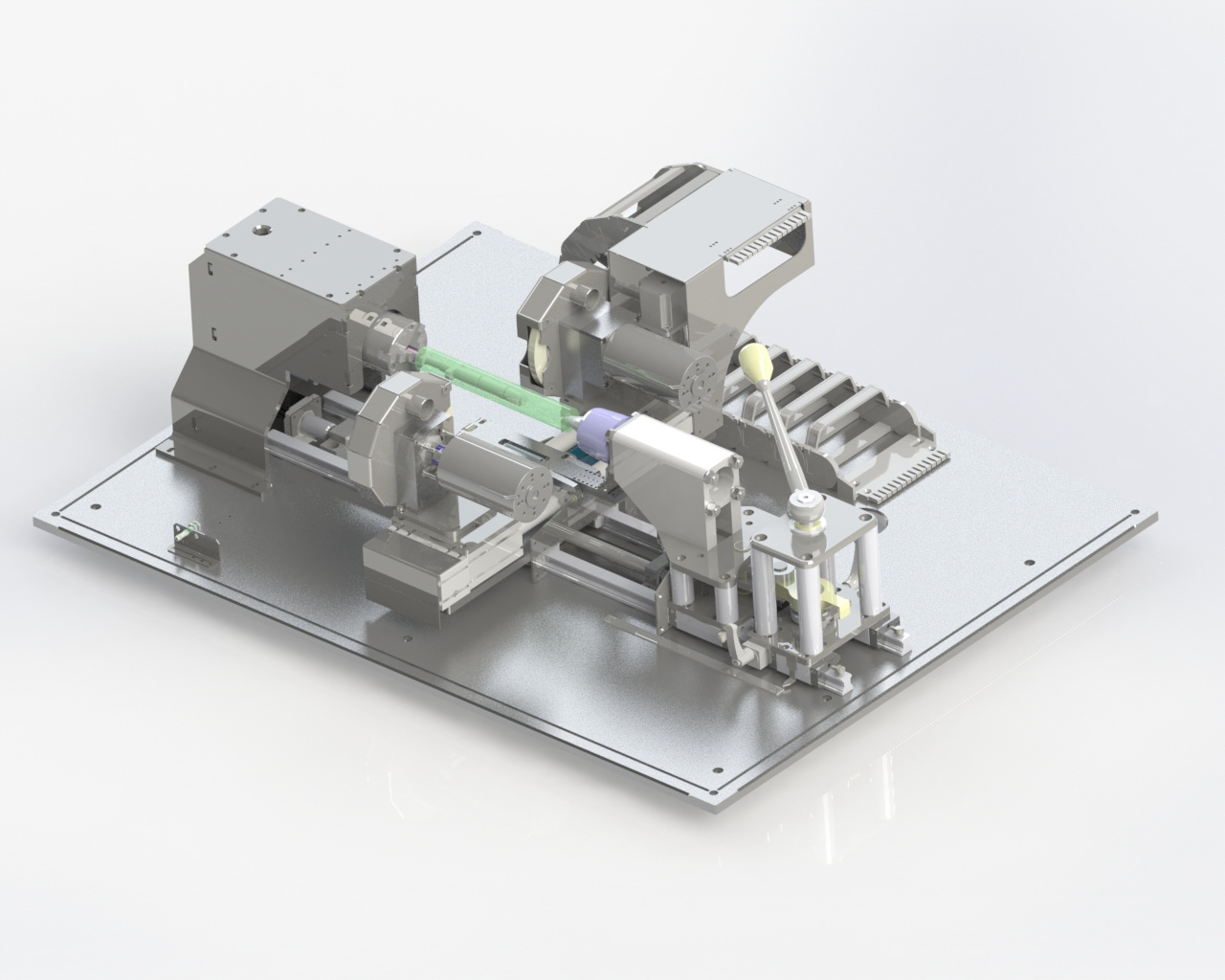 der Kolben. Die Absaugung, Stromversorgung und Sensorik ist in Längsrichtung (Z-Achse) über eine Energiekette schleppgeführt. Über ein Lineal kann die Rüststellung eingestellt werden.