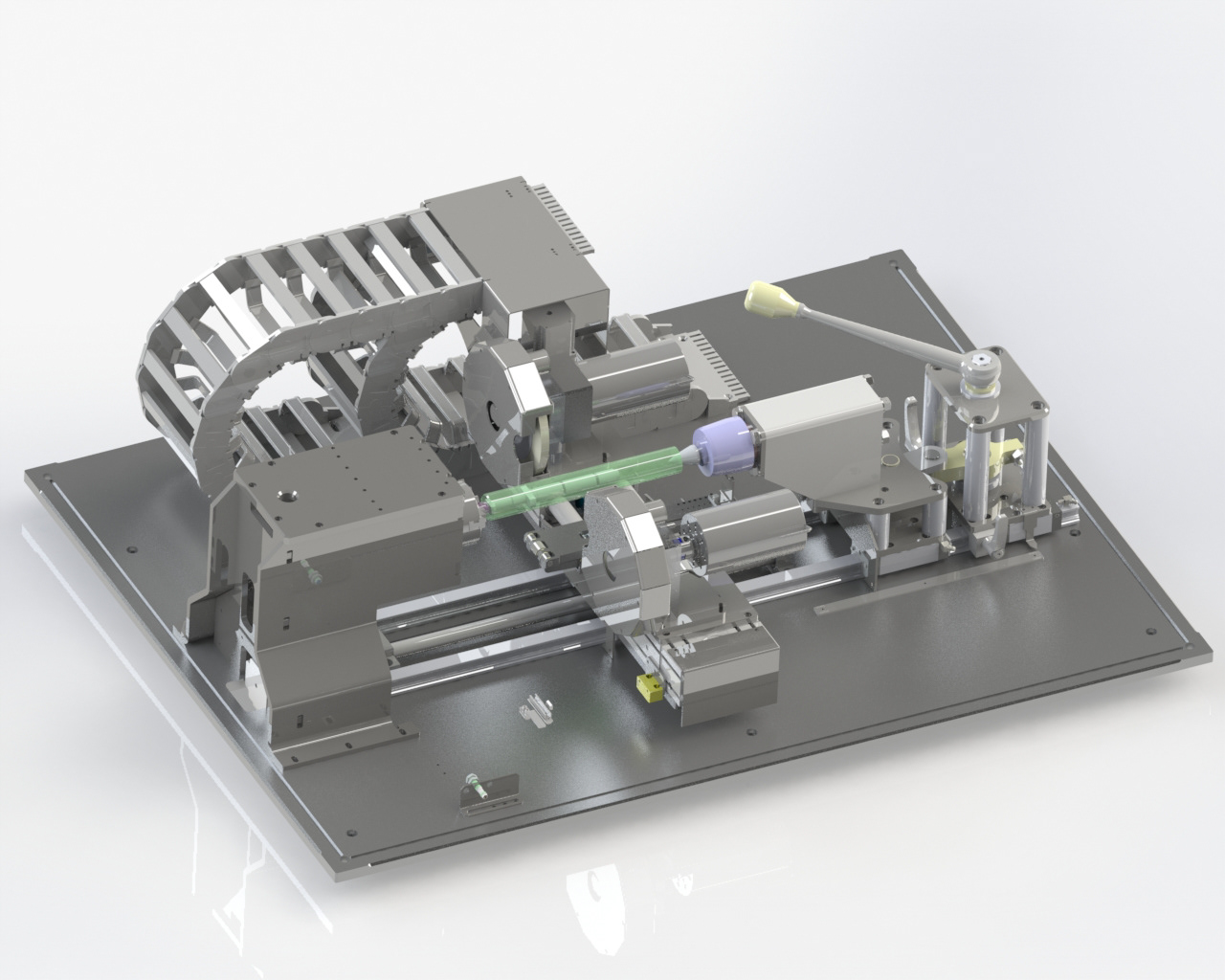 Das Achssystem ist wie bei einer CNC-Drehmaschine aufgebaut. Der Längsschlitten (Z-Achse) ist wird mittels Schrittmotor auf einer Trapezspindel bewegt. Geführt wird dieser